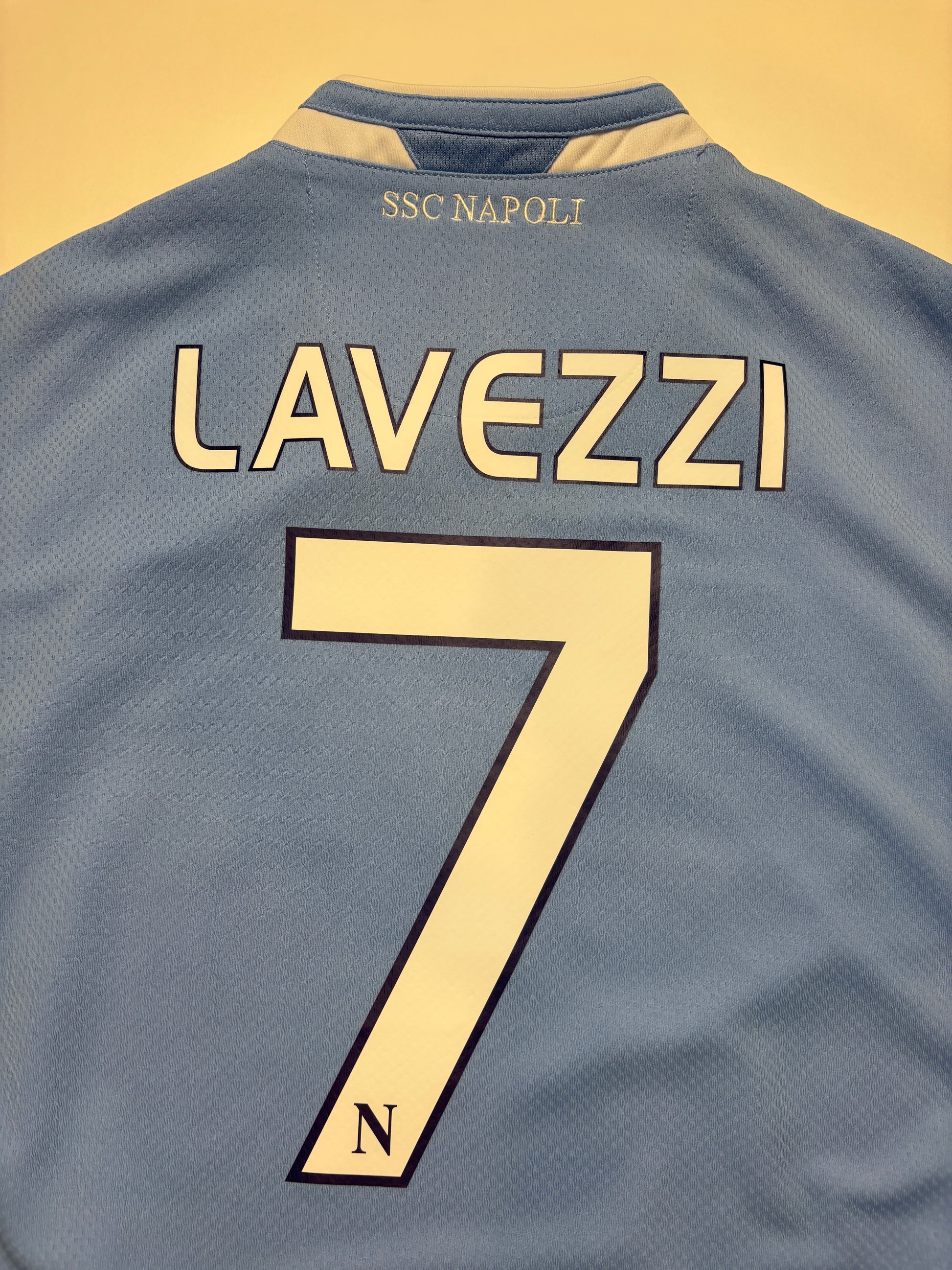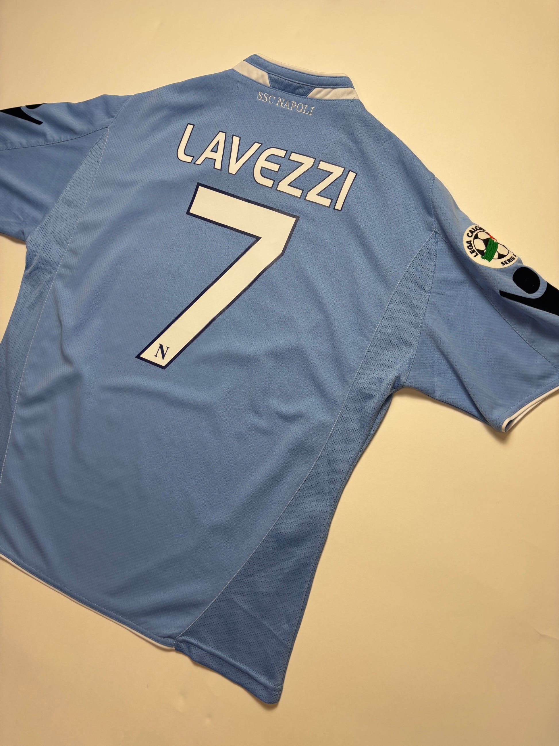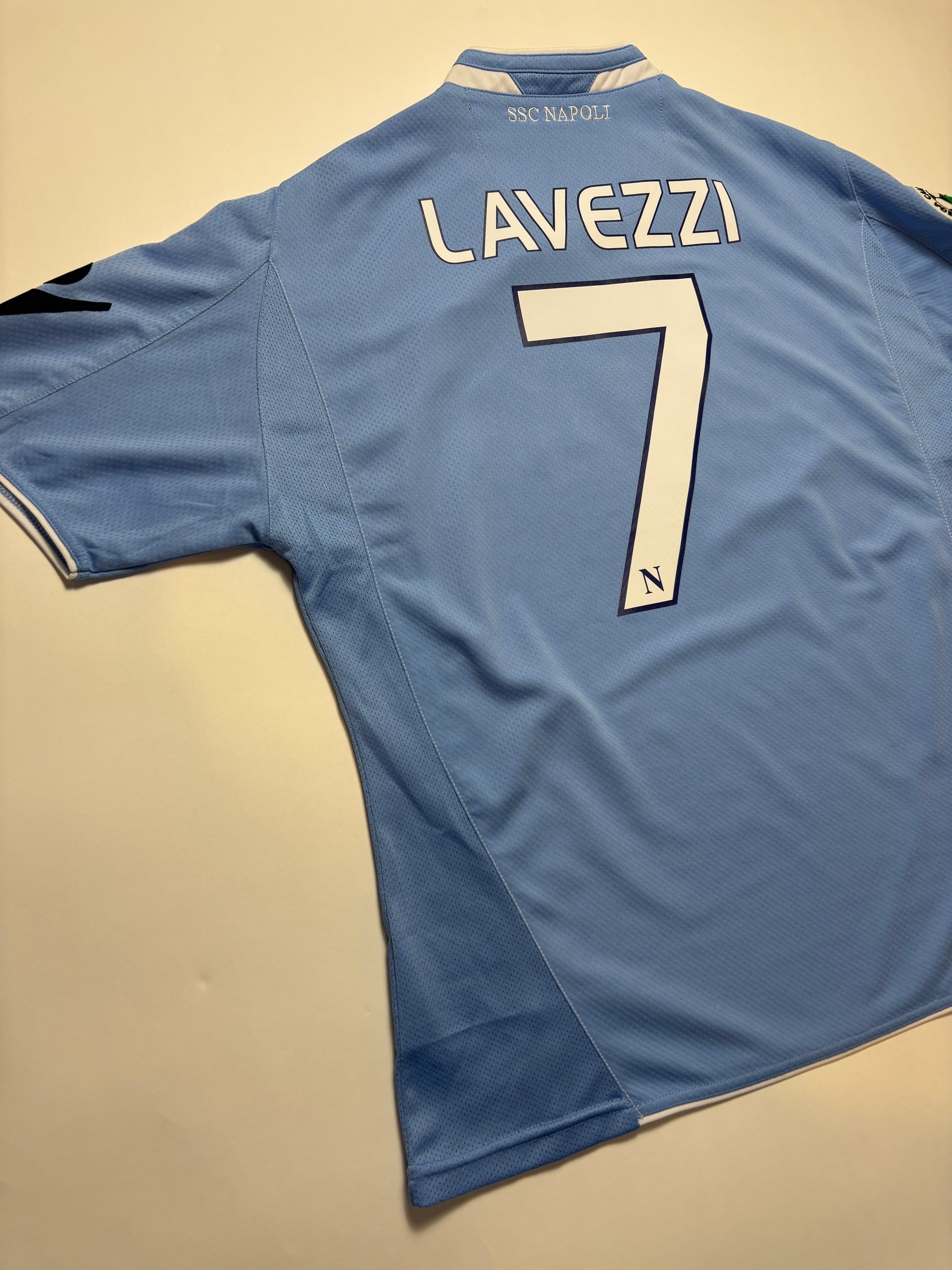 Napoli Home Shirt 2009/10 featuring Ezequiel Lavezzi. As worn when he featured as one of the team’s most important playmakers helping Napoli finish 6th, qualifying for the Europa League.